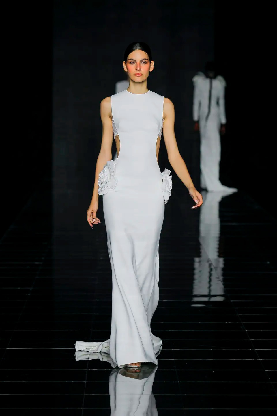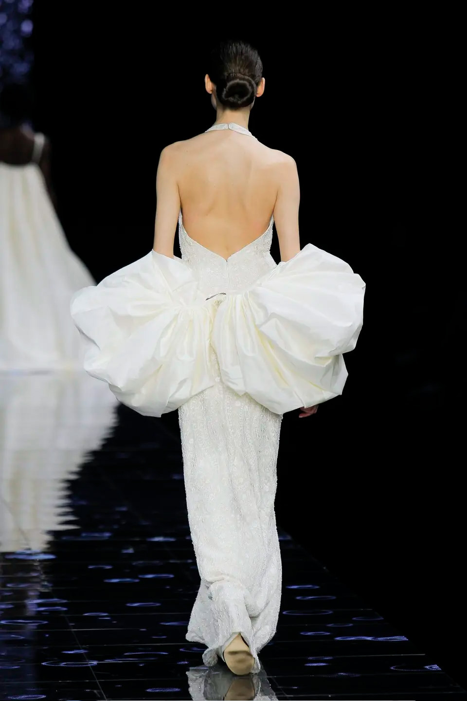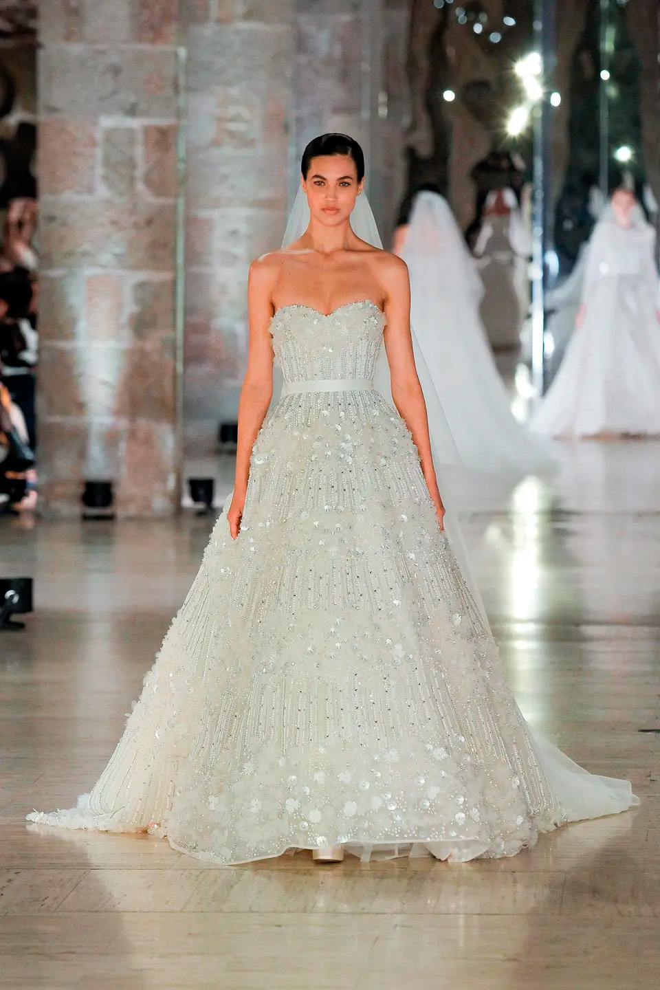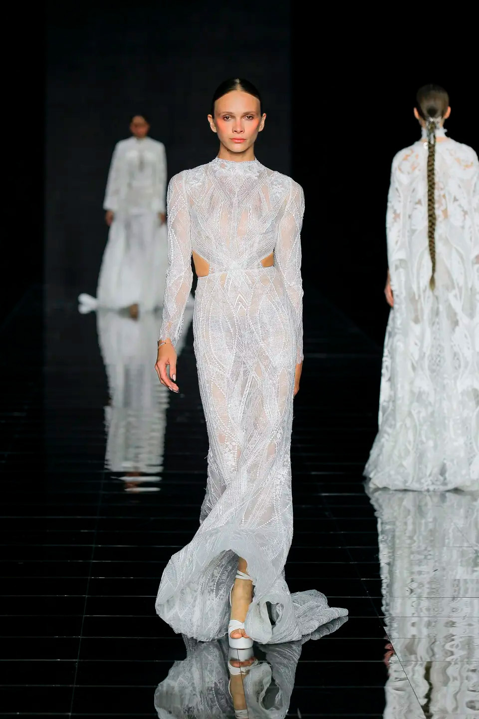 Outra tendência que brilhou literalmente foram as peças cintilantes. Elas já estão presentes em vestidos nupciais há tempos, mas a temporada 2024 vai além no uso do brilho: literalmente dos pés à cabeça, com tecidos já brilhosos ou inteiramente bordados.