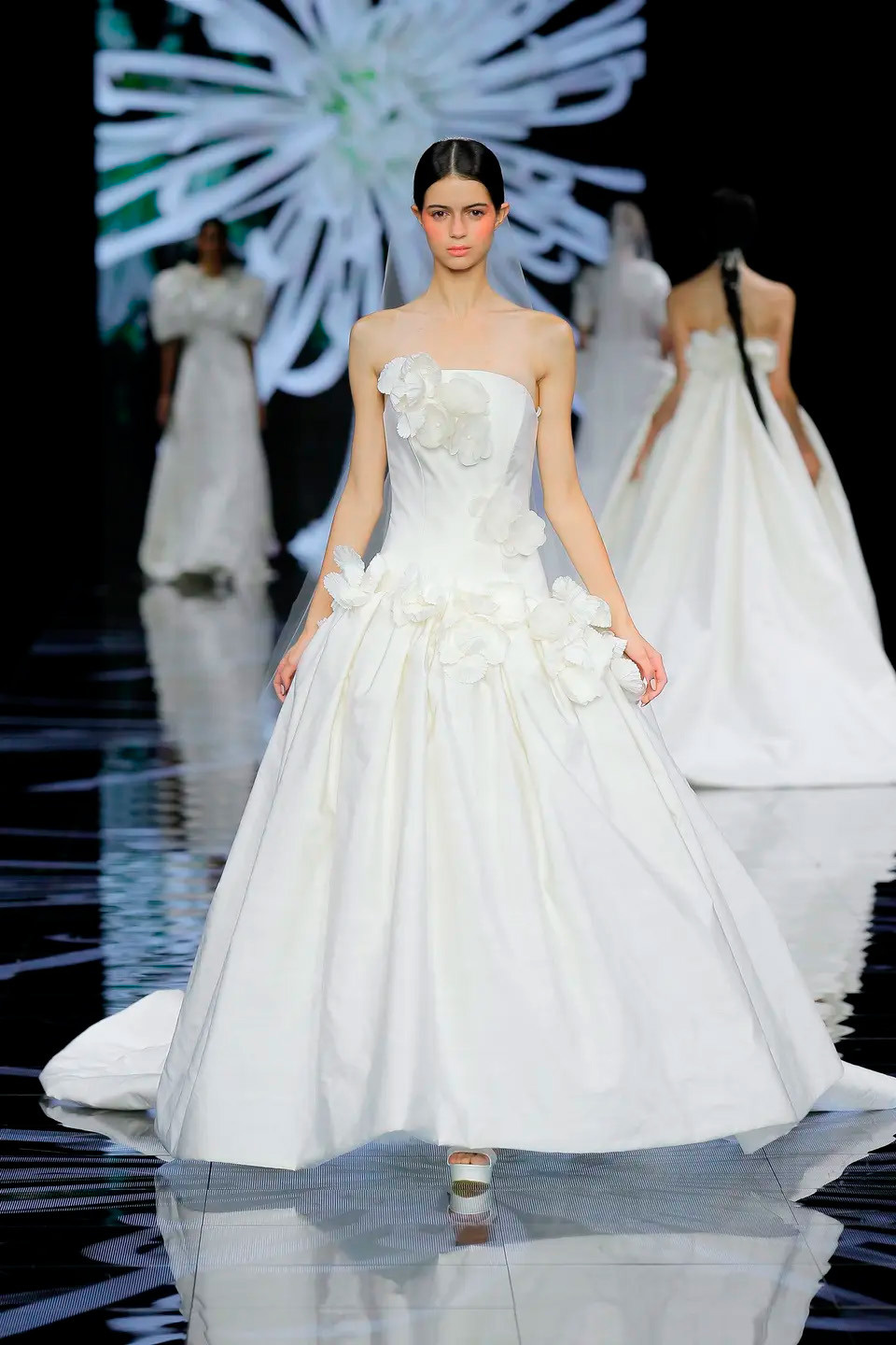 Além disso, as aplicações em 3D e os babados merecem seu devido destaque. As maxi aplicações apareceram em diversas coleções de vestidos de noiva 2024, e mostram que a moda volta a jogar com volumes e texturas, e o universo nupcial abarca esse retorno.