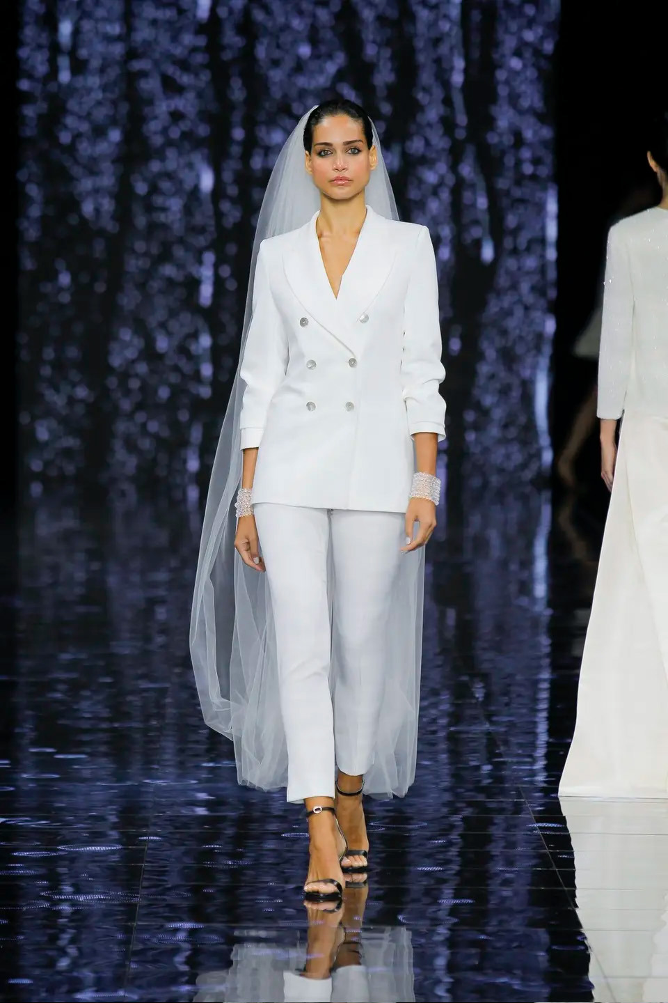 Não é novidade que algumas noivas preferem deixar de lado os tradicionais vestidos, e uma das opções são calças de alfaitaira ou pantalonas, por exemplo. Com cortes alinhados, caimento perfeito e ainda acompanhadas de blazers ou tops com efeito blusado, esses conjuntos de alfaiataria feminina aparecem nos desfiles e apontam uma tendência.