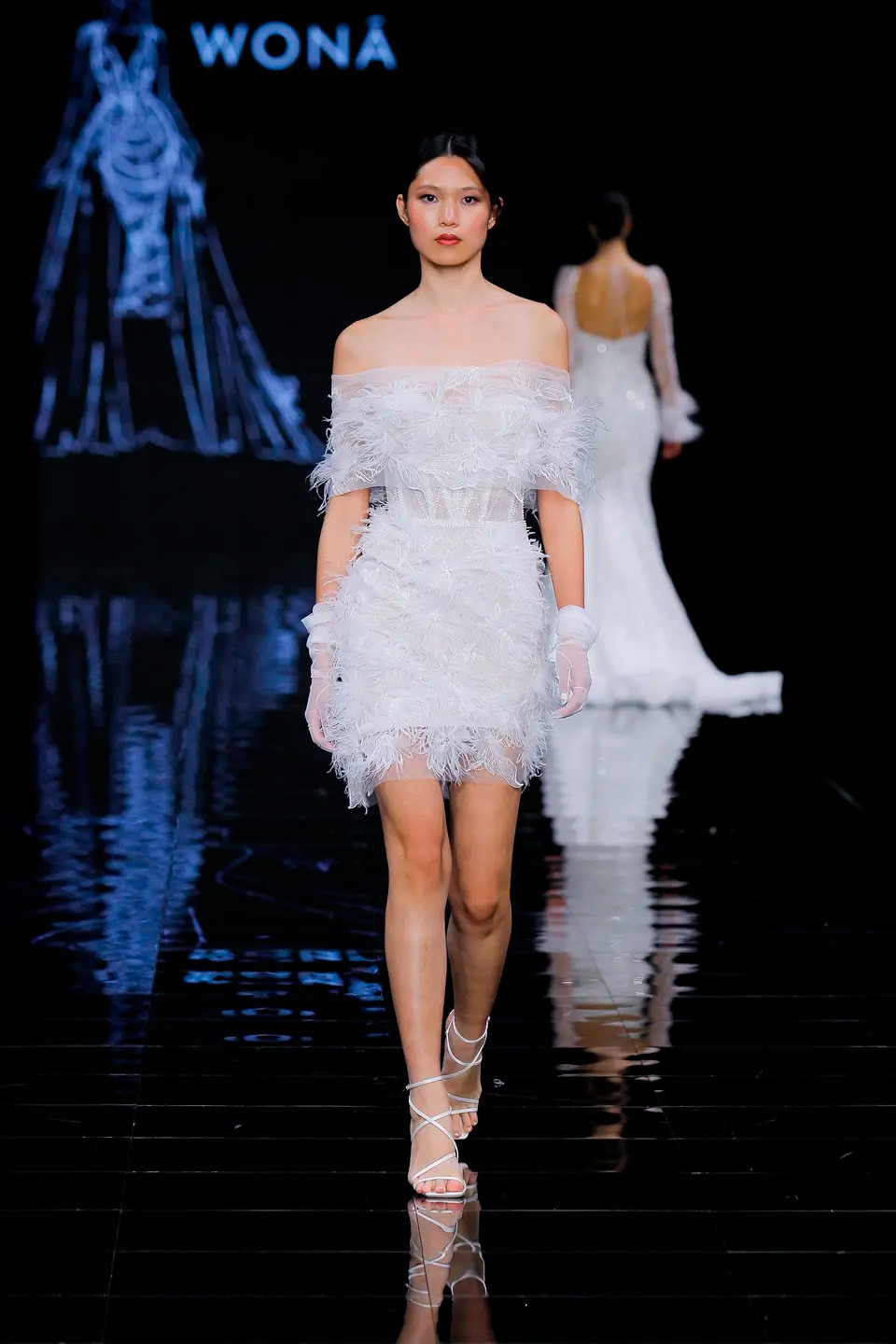 O comprimento curto ganhou as passarelas, e essa tendência nupcial aponta para casamentos menos formais, e com mais informação de moda. Quase sempre acompanhados de caudas, que equilibram a peça, os modelos chegaram com as mais variadas silhuetas.